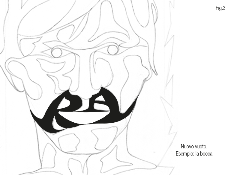 Una delle fasi più importanti per la realizzazione dell’opera è sicuramente quella progettuale. L’idea può nascere anche casualmente. Spesso il soggetto è legato ad un pensiero, ad un ricordo o dedicato a qualcosa o a qualcuno. I primi strumenti sono un semplice foglio di carta ed una penna. Scarabocchiando, abbozzando e trasformando delle lettere l’immagine si materializza. Naturalmente la conoscenza e l’esperienza nel creare graficamente nuovi font mi consentono di essere padrone del segno e di poter aggredire, violentare la forma originale della lettera. La forma delle lettere che disegno è riconducibile ad un carattere graziato, quello comunemente conosciuto come Times o Bodoni. Le grazie (estremità) di questo tipo di carattere sono l’elemento che più si presta alle distorsioni che voglio ottenere. Prima di procedere con il disegno, l’immagine è già scolpita nella mia mente e trasformata in lettere. Nasce così la mia opera, caratterizzata da alcuni elementi ricorrenti, uno di essi è la cornice che ogni volta assume forme differenti, ma che fondamentalmente rimane la stessa per indicarci una sorta di finestra sul mondo, rappresentata come una lastra di vetro rotta, dietro la quale si può osservare e “leggere” il dipinto. Dal punto di vista della costruzione dell’opera, anche la cornice contribuisce alla formazione di quei “vuoti” e “pieni” dando origine ad un’immagine.